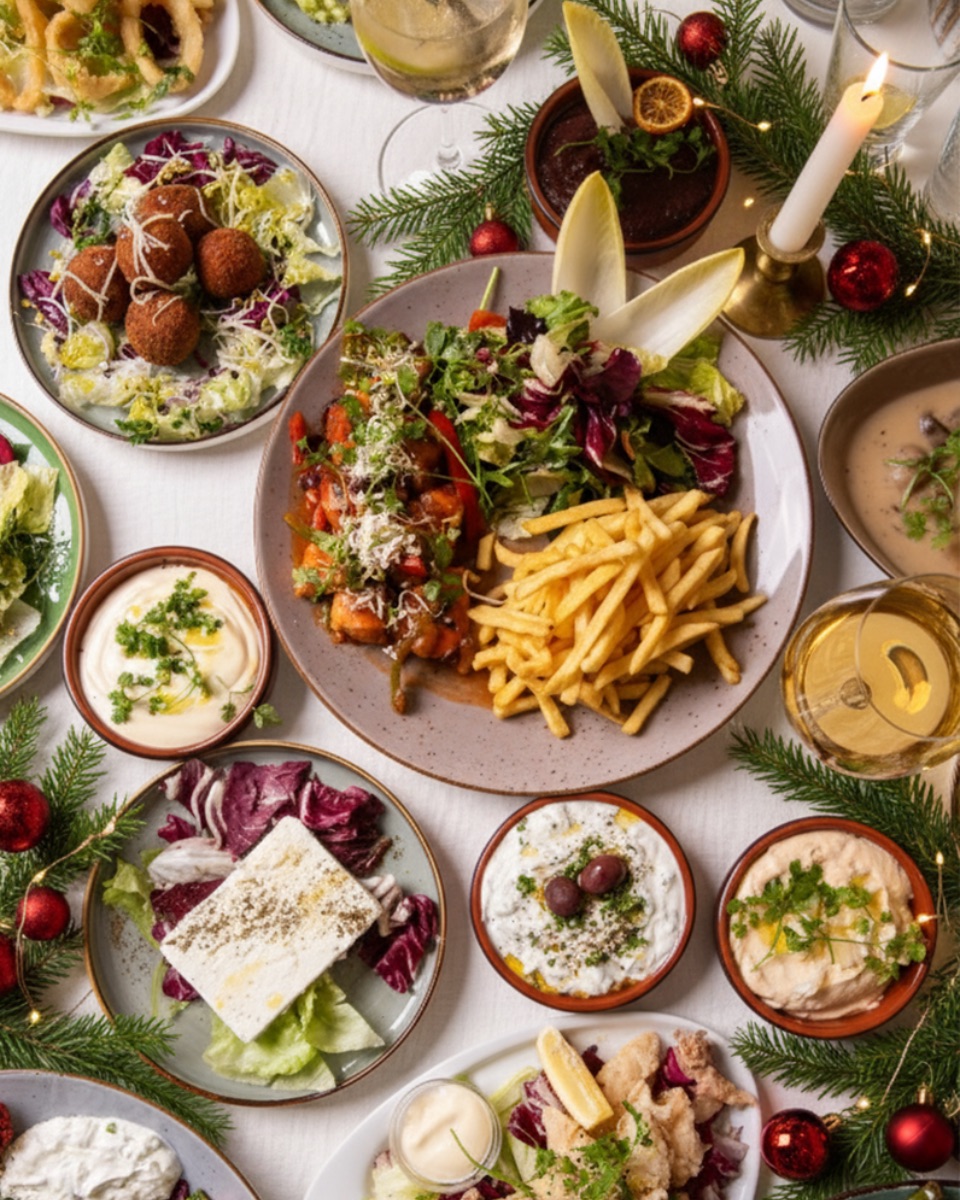 Bei uns steht ein vielfältiges Weihnachtsbuffet bereit: Frische Salate mit Feta & Oliven, Zaziki und Antipasti servieren wir zusammen mit warmen Gerichten wie gegrilltem Fleisch, Gemüseaufläufen oder Meeresfrüchten – immer gewürzt mit mediterranen Kräutern und Gewürzen.